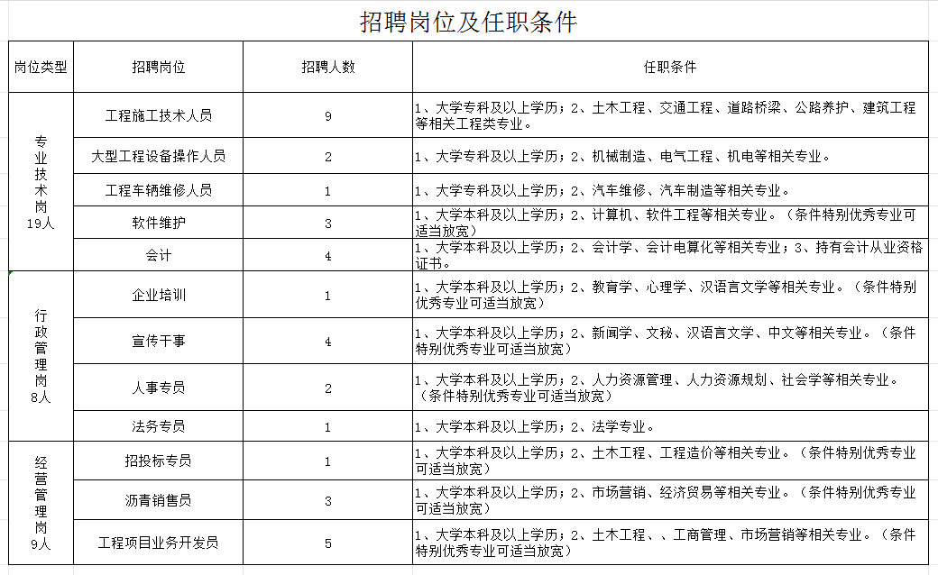 專業(yè)技術(shù)人員、行政管理人員、經(jīng)營管理人員。(招聘具體崗位及任職條件詳見下圖)。